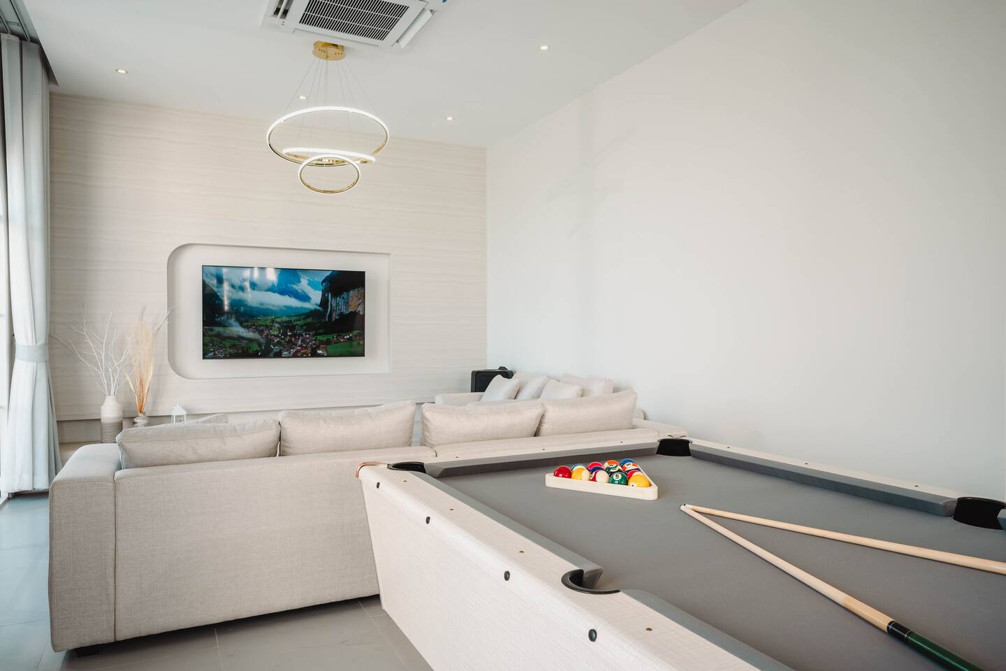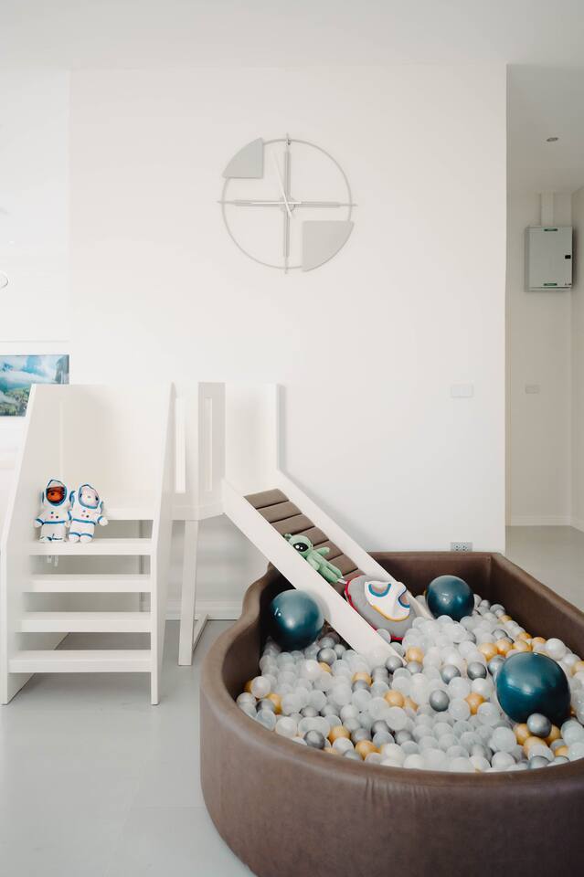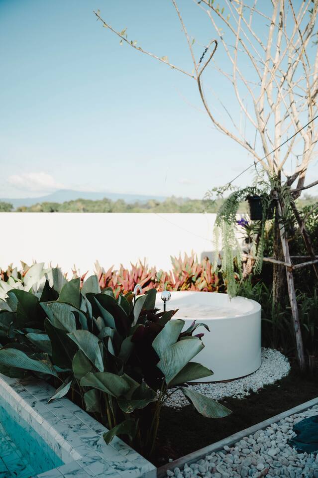 🏡 Spacious 4-Bedroom Villa (328 sqm) - Sleeps up to 12 guests comfortably with option for 3 additional guests - Master bedroom with twin beds (2 guests) - Two double bedrooms (4 guests each) - Fourth bedroom with twin beds (2 guests) - 5 full bathrooms for ultimate convenience 🏊♀️ Premium Saltwater Pool & Outdoor Living - Private saltwater swimming pool (3.5m x 7m, 130cm deep) - Dedicated children's pool (50cm deep) - perfect for families - Outdoor jacuzzi for relaxation under the stars - Outdoor shower for a unique tropical experience - BBQ area with electric grill and shabu-shabu setup - Pool table for entertainment 🎵 Entertainment & Modern Amenities - Smart TV with karaoke system - sing your heart out! - Complimentary high-speed WiFi, Netflix & YouTube Premium - Fully equipped modern kitchen with all appliances - Air conditioning throughout - Premium bathroom amenities included 🌄 What Makes Us Special - Stunning mountain panoramas from every villa - Private and secluded - perfect for groups and families - Pet-friendly - bring your furry family members (small breeds welcome) - Professional BBQ facilities - create memorable evenings - Family-focused with children's amenities and safety features 🚗 Convenient Location - Easy access from Bangkok - Private parking for 4-5 vehicles - Peaceful Sarika district setting - Close to Nakhon Nayok's natural attractions Perfect for family reunions, group getaways, romantic retreats, or corporate team-building events. Experience the serenity of mountain living with all the comforts of a luxury resort.
